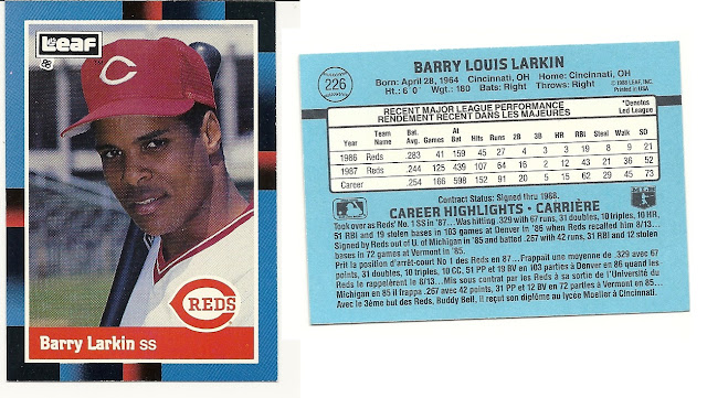 Turning our attention to the Larkin card in question, it's actually fairly boring. The Leaf card is basically a direct copy of the 1988 Donruss card - except with French added.